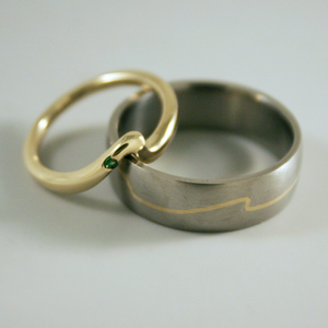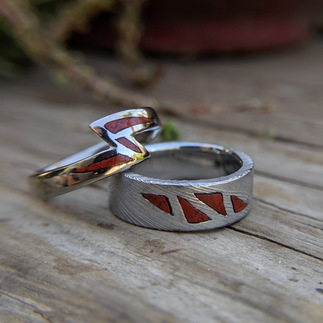 Sometimes a couple wants different style rings, but they still want to incorporate a shared element - even if they're the only ones who know! From L to R: a very subtle Chinese character in contrasting metals; this set shares an ocean element theme ocean between her octopus inspired ring and his Hokusai's wave; a turquoise insert on his band to coordinate with the inlay on the outside of his band.